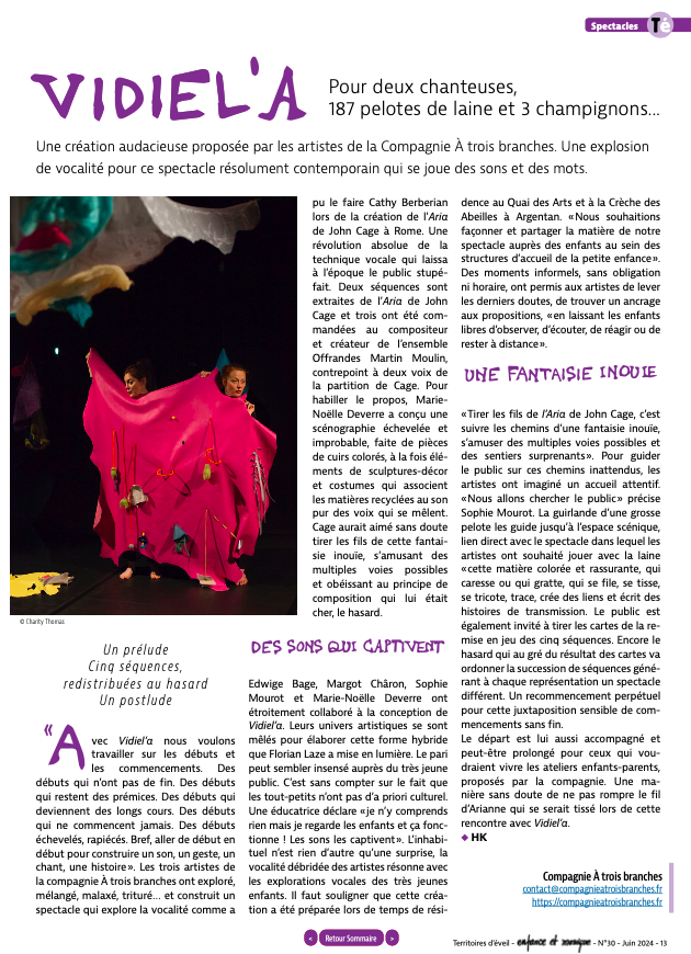 Au début de la création de Vidiel’A, il y eu l’envie de travailler Aria, de John Cage. Cette partition est, à la fois dans son écriture et dans sa musique, une succession de commencements. Des sons, des